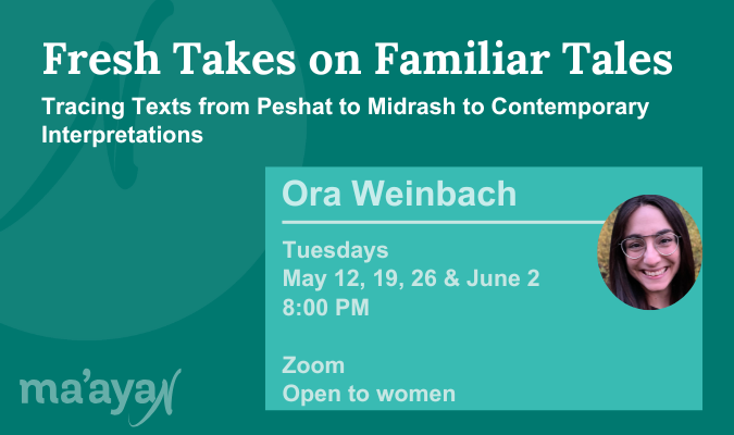 - Fresh Takes on Familiar Tales: Tracing Texts from Peshat to Midrash to Contemporary Interpretations with Ora Weinbach, Tuesdays, May 12 – June 2 at 8:00 pm. Open to women.