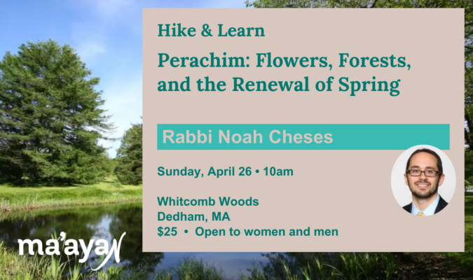 - Hike & Learn Perachim: Flowers, Forests, and the Renewal of Spring with Rabbi Noah Cheses, Sunday April 26 at 10:00 am. Open to women and men.