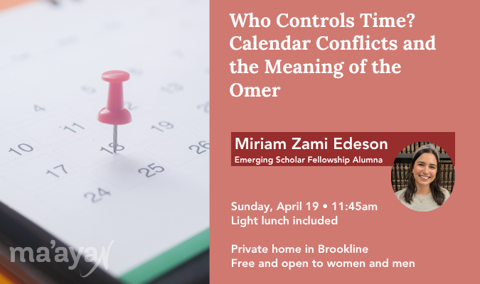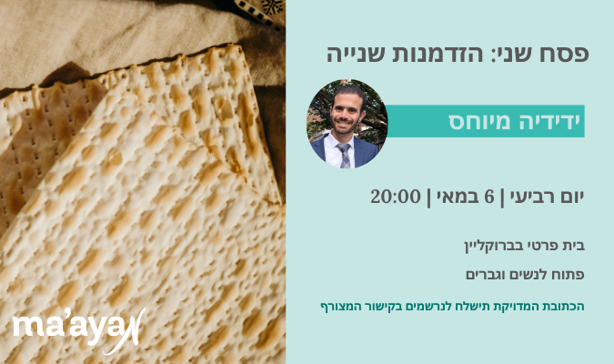 - פסח שני: הזדמנות שנייה with Yedidya Meuchas, May 6 at 8:00pm. In Hebrew. Open to women and men.